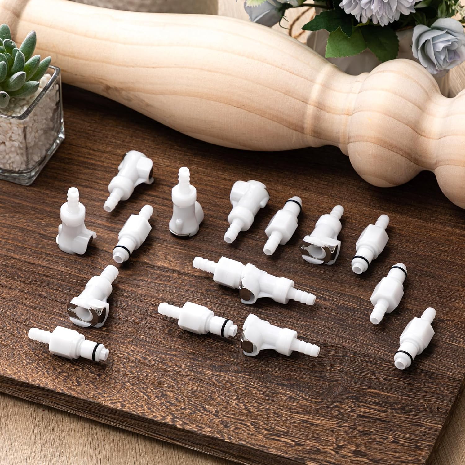 Chunful quick-disconnect hose barb insert set displayed on a workbench