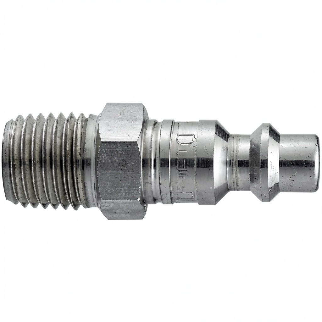 Installation involves connecting the plug to standard NPT threads on air hoses or equipment, ensuring a tight seal with appropriate tools.