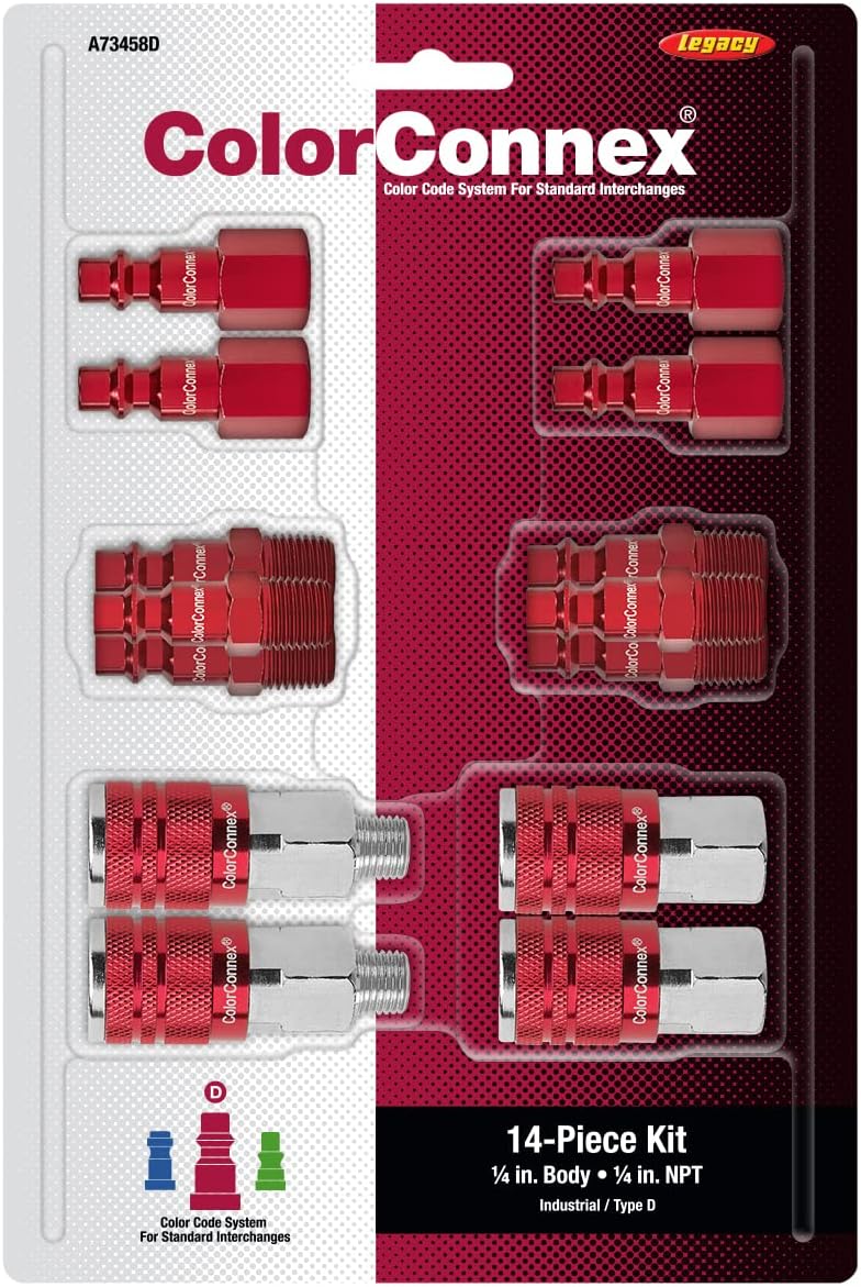 The Legacy Manufacturing 14 Piece Quick Connect Hose Fittings set offers reliable, color-coded connections for air tools, preventing cross-contamination between lubricated and dry lines. Made from durable aluminum and steel, it’s perfect for automotive shops, job sites, or home garages. This versatile kit includes couplers and plugs for various industrial and DIY applications.